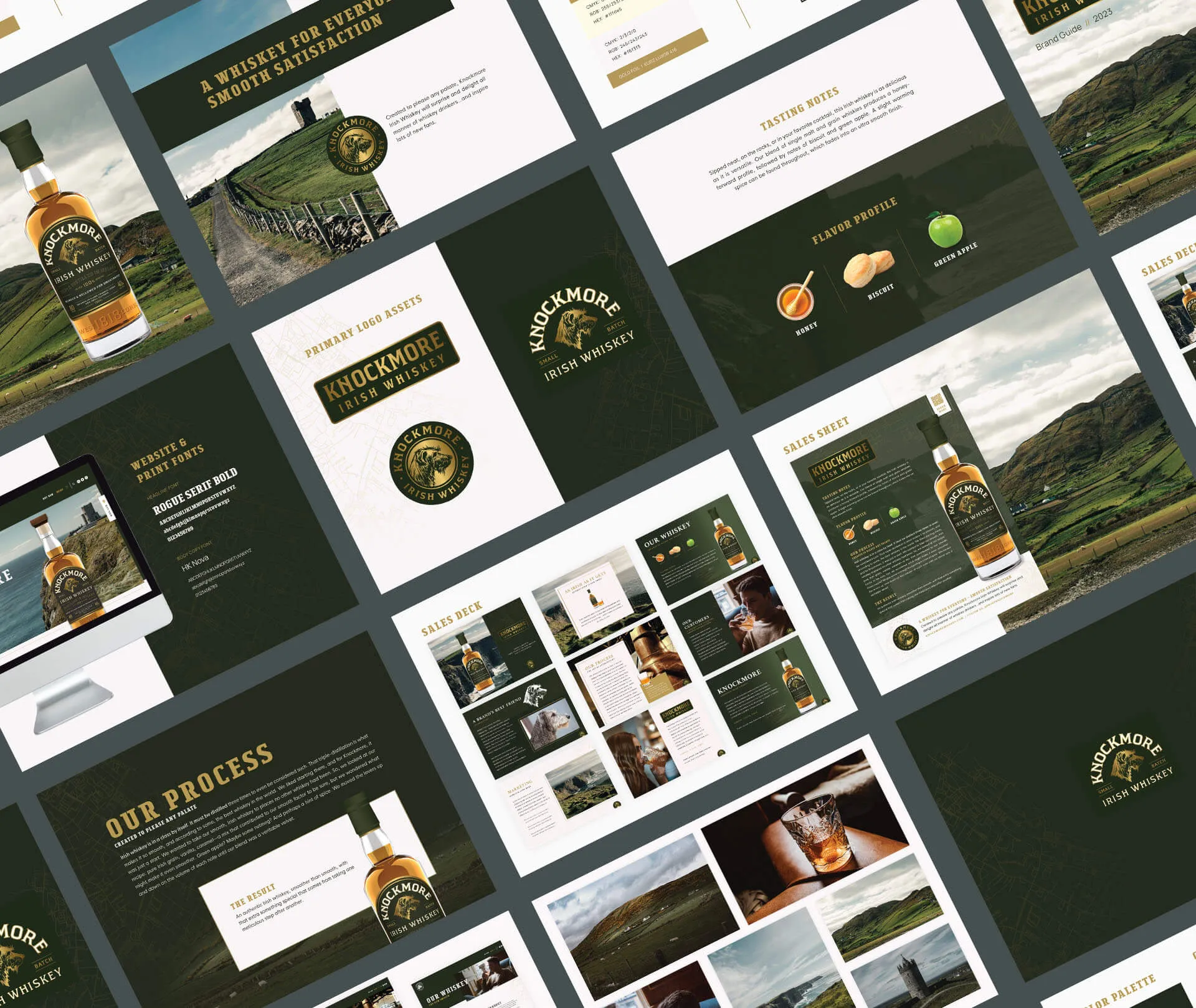 Our team collaborated to tell the unique Knockmore story through an intricate website and sales materials. The completed website extends iconic Irish and wolfhound symbols through subtle, yet detailed illustrations. Custom development choices were made to integrate movement within the site. With collaboration from a skilled copywriter, text was created to extend the branding.