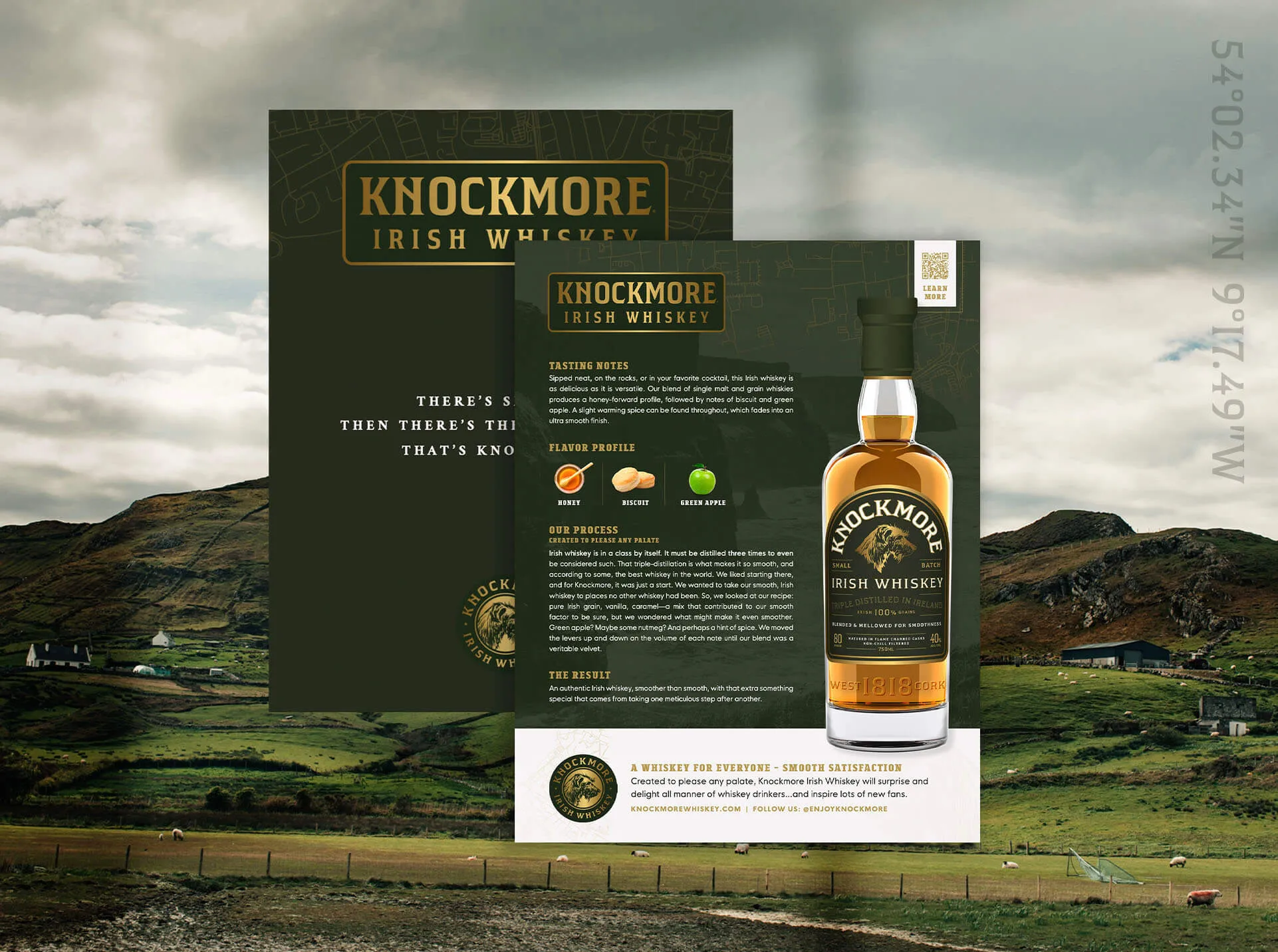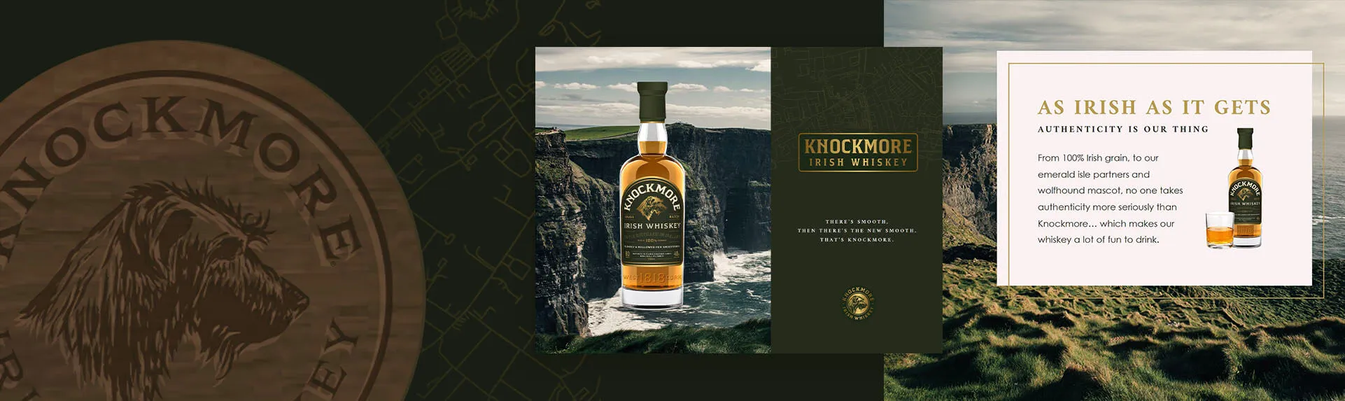 Knockmore is a blend of 100% Irish malt whiskey and authentic local grain whiskey. Inspired by Knockmore Mountain, where the most gifted Irish wolfhounds were born and raised. Like the wolfhound, Knockmore is unique and easygoing.